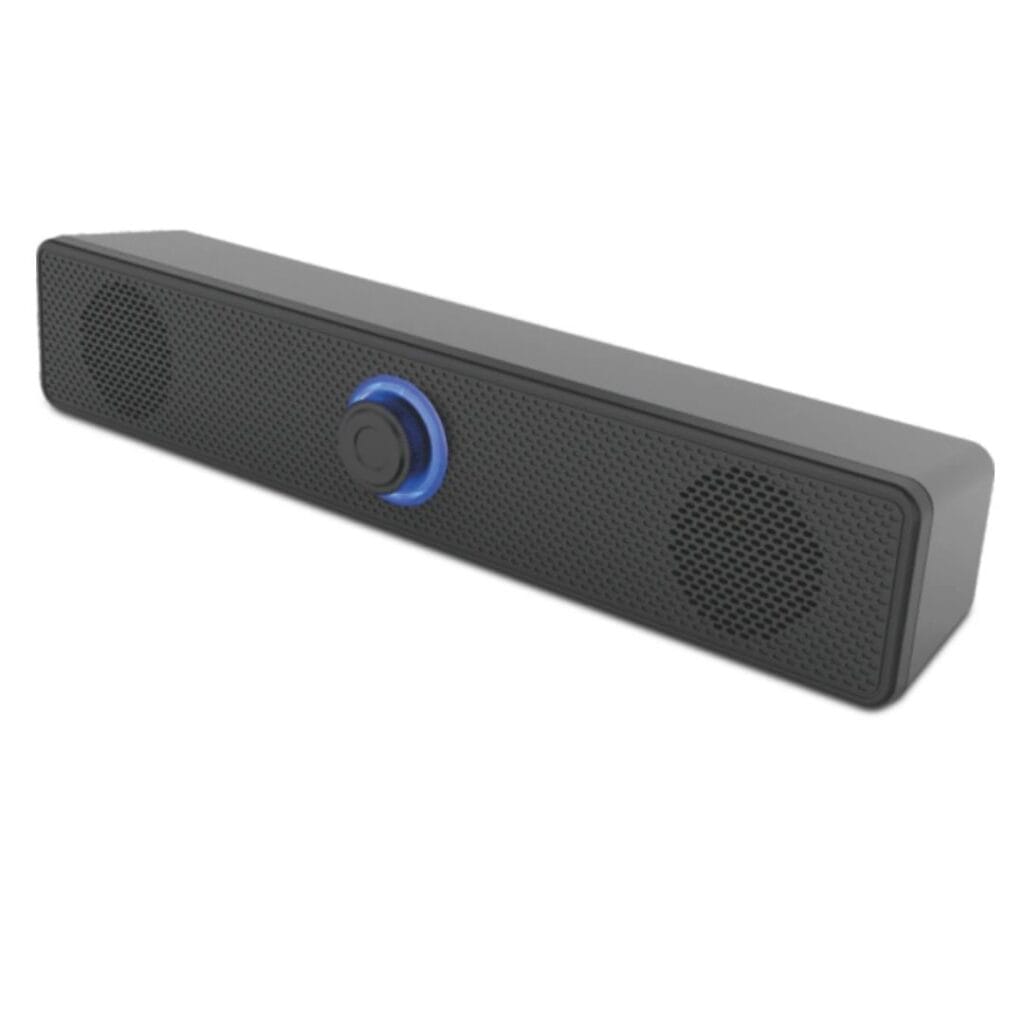 Barra de sonido compacta para PC con audio estéreo nítido, control de volumen iluminado y alimentación USB. Ideal para computadoras, notebooks y escritorios minimalistas.