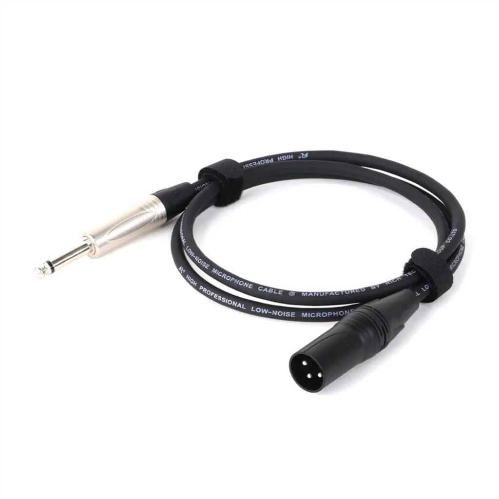 Cable para conectar instrumentos musicales como guitarras o equipos de audio con conectores 6.35mm, con una longitud de 5 metros para mayor flexibilidad en escenarios o estudios.