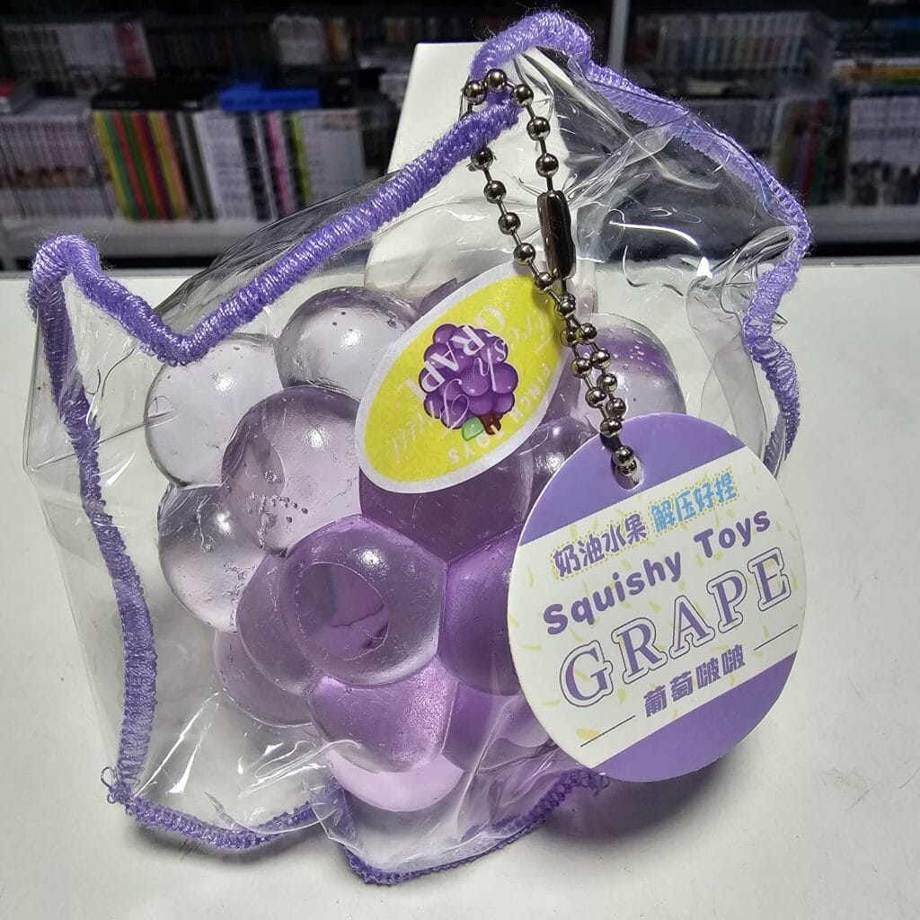 Squishy en forma de racimo de uvas, ideal para aliviar estrés y estimular la sensación táctil.